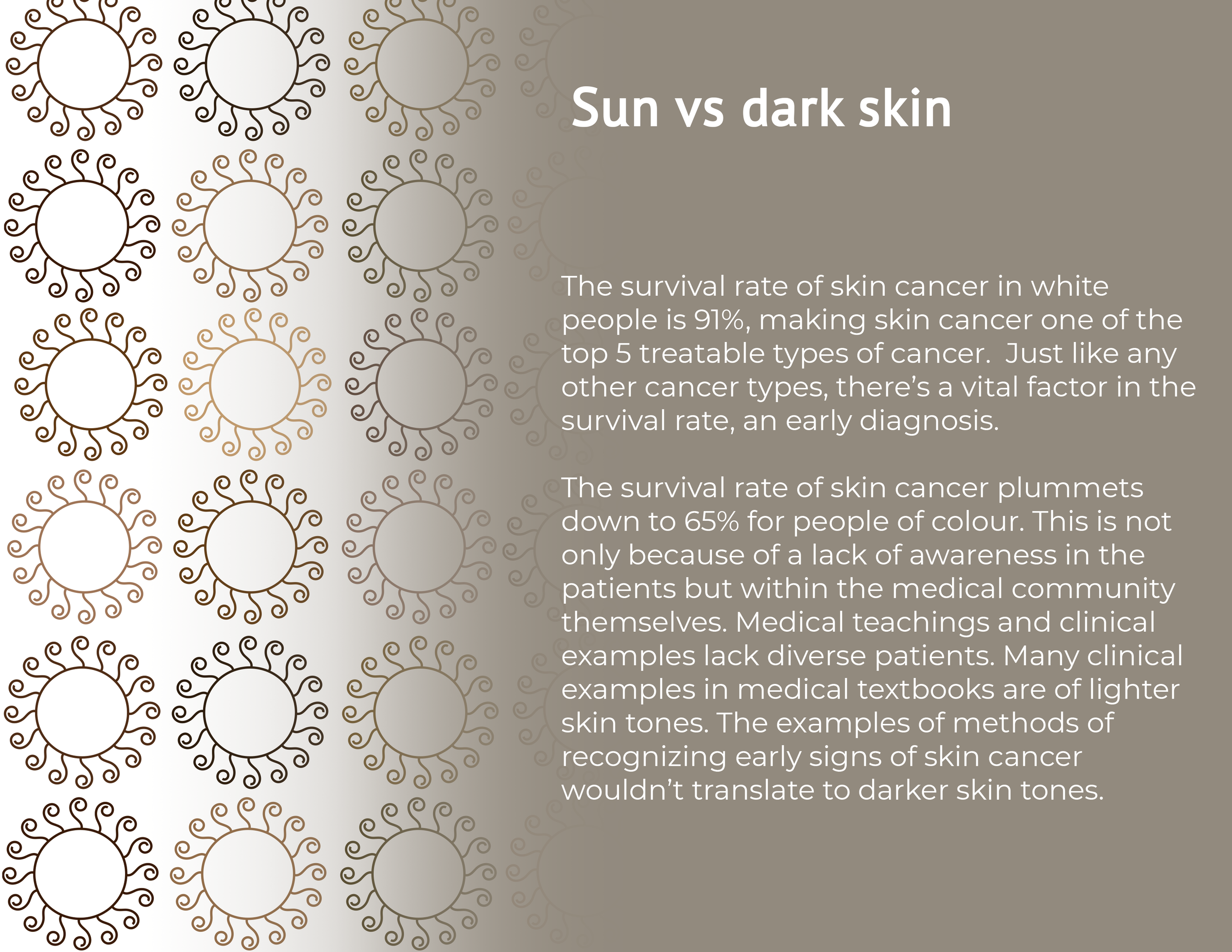 While skin cancer has one of the highest survival rates, the percentage dramatically drops down in people with darker skin. This is mostly due to the misinformation that the darker/tanner your skin gets the less you need sunscreen. The lack of illustrated skin conditions on dark skin also contribute to the misinformation.