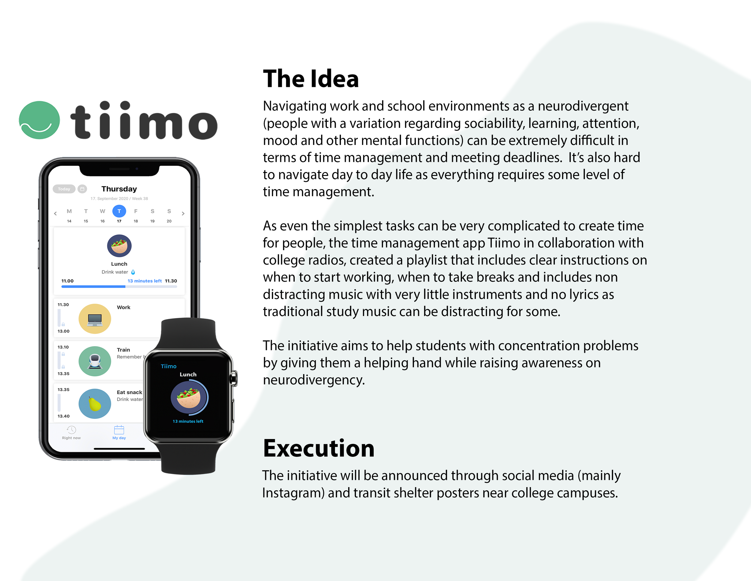 Teaming up with different streaming services like YouTube and Spotify to create different playlists for better time management, getting people’s attention on this companion app. There will be bus shelter ads well as social media apps that’ll emulate a phone error to get attention of people on burn outs caused by overwhelming deadlines that can be helped with better time management.